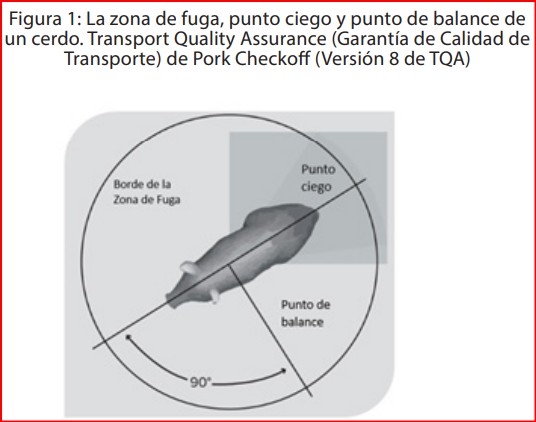 En la Figura 1 se muestra la zona de fuga. La zona de fuga es el espacio que un animal considera como su espacio personal. Y puede cambiar de acuerdo con la frecuencia y calidad de interacción humana que haya tenido. Cuando se daña la zona de fuga de un cerdo, el animal se mueve hacia la dirección contraria, buscando mantener una distancia segura entre ellos y el técnico. Cuando se mueve a los cerdos, es importante entender los cambios en su lenguaje corporal y en su comportamiento general. Si los cerdos se estresan, y esto se demuestra con vocalizaciones anormales, rigidez, temblor en los músculos, o reticencia a moverse, disminuya la presión y permita que los cerdos se calmen antes de continuar. (Manual de TQA)