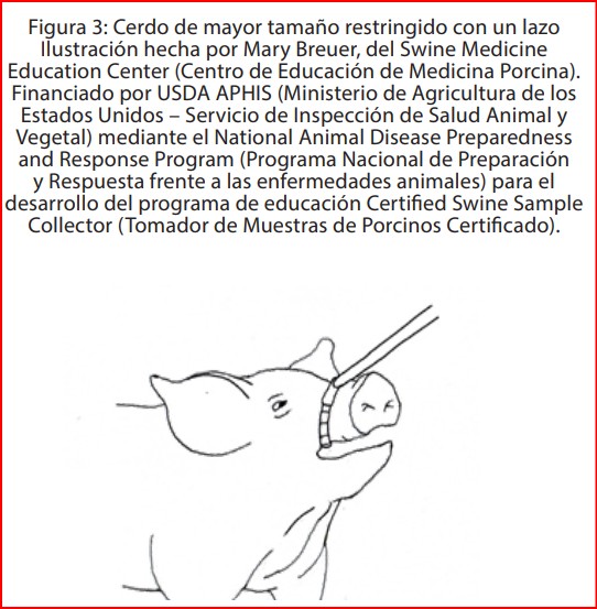 Para restringir a un animal más grande, se usa un lazo restrictivo tal como se lo muestra en la Figura 3. Es importante que la persona que realiza esta acción haya tenido el entrenamiento adecuado con esta herramienta para la seguridad del animal y del técnico. Es importante recordar que no se debe restringir a los cerdos por periodos extensos de tiempo, mover a los cerdos con el lazo, o atar al cerdo con el lazo.