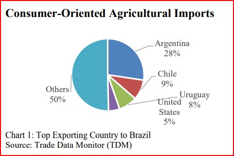 La industria alimentaria brasileña está altamente desarrollada y es competitiva, dominada por grandes empresas multinacionales. Los productos alimenticios estadounidenses generalmente no pueden competir en precio con los productos nacionales brasileños ni con los productos de los países del Mercosur debido a los tipos de cambio y los aranceles de importación, lo que posiciona las importaciones de EUA como productos premium en el mercado brasileño.