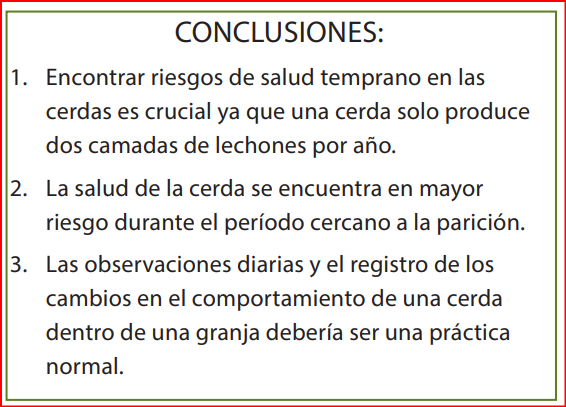 La importancia de identificar las cerdas en riesgo en parición El período de tiempo cercano a la parición presenta el mayor riesgo de problemas de salud para las cerdas. Estas cerdas en riesgo pueden tener un aumento en los lechones nacidos muertos, una disminución en el número de lechones destetados, y, eventualmente, la extracción prematura de estas cerdas del rebaño. El control extensivo de las cerdas durante la parición lleva a las intervenciones de manejo para mejorar, a largo plazo, el bienestar y la productividad de estos animales y la detección de las cerdas en riesgo. Es importante registrar estos indicadores como parte de la práctica normal de la granja.