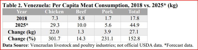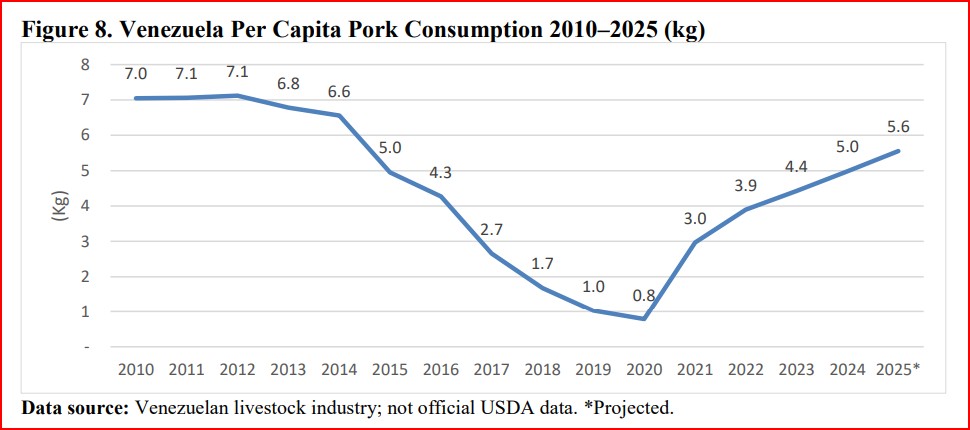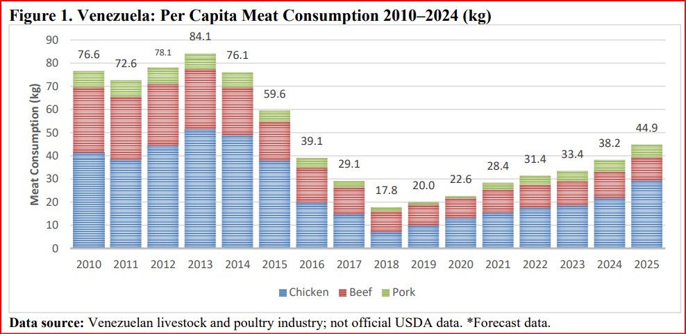 25 September 2025VENEZUELA – Este es un Resumen del Informe Anual de Ganado y Productos del Departamento de Agricultura de los Estados Unidos, en el cual se proyecta que el consumo total de carne per cápita de Venezuela en 2025 alcance los 45 kilogramos, lo que representa un aumento del 153 % con respecto a su mínimo histórico de 2018.