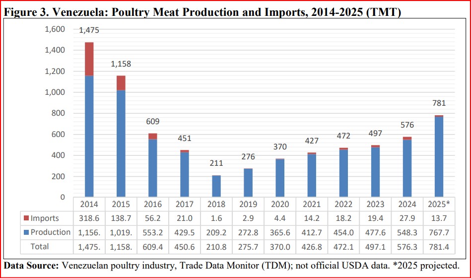 Las fuentes de información de Post Post reportan que la producción de carne de pollo de Venezuela en 2024 ascendió a 548.348 toneladas métricas, un aumento interanual del 15 %. Para 2025, se proyecta un aumento del 40 %, alcanzando aproximadamente 768.000 toneladas métricas (Figura 3). Durante el primer semestre de 2025, la producción mensual promedio de carne de pollo alcanzó las 68.034 toneladas métricas, un aumento del 49 % en comparación con el mismo período de 2024.