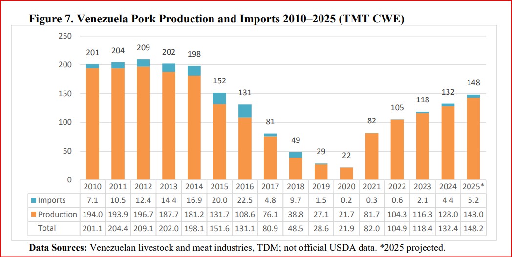 Post estima que la producción de carne de cerdo venezolana para 2025 será de 143.000 toneladas métricas, un aumento del 12 por ciento con respecto a 2024. En base a esta proyección de producción, la industria porcina venezolana requerirá aproximadamente 275.500 toneladas métricas de maíz amarillo y 92.000 toneladas métricas de harina de soja este año.