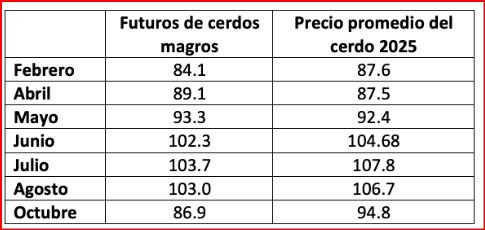 • Futuros de cerdo magro el viernes pasado en comparación con el precio promedio del cerdo en Iowa para el mismo mes en 2025.