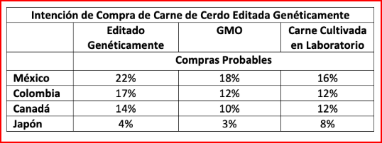 La encuesta indica que el etiquetado claro es importante, es decir, “Carne de Cerdo Editada Genéticamente”: Japón 72%, Canadá 69%, Colombia 61%, México 57%. No cabe duda de que la idea de que empacadores, minoristas y servicios de alimentos intenten “colarse” con carne de cerdo editada genéticamente en la cadena alimentaria podría provocar graves repercusiones de daño a la marca para quienes ignoren el fuerte sentir del consumidor.