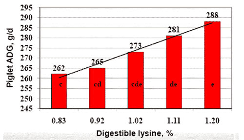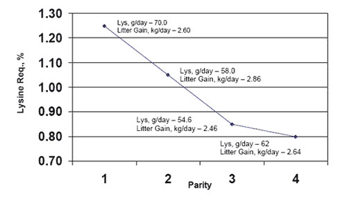Resumen de estos experimentos, el consumo total de lisina de 70 g por día o 62 gramos de lisina por día de SID (Standardized Ileal Digestible) optimizan el rendimiento reproductivo y la producción de leche en cerdas PIC. Debido a que las cerdas jóvenes comen 10 a 15 por ciento menos que las cerdas adultas, el porcentaje de SID de la lisina en la lactancia debe aumentar en comparación con un rebaño de cerdas maduras.
