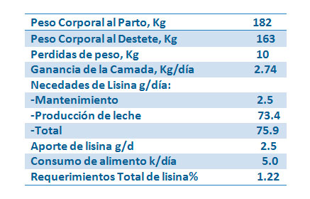 La tabla 2 muestra la predicción de las necesidades de lisina para la primera camada de una cerda prolífica basado en la estimación de su potencial de producción de leche.