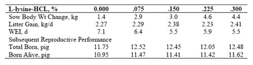 Estos estudios indican que hasta un 0,30% de lisina sintética se puede agregar a las dietas de las cerdas primíparas sin menoscabar el rendimiento reproductivo o de la producción de la leche. Esta respuesta también ha sido validada en cerdas de más edad.