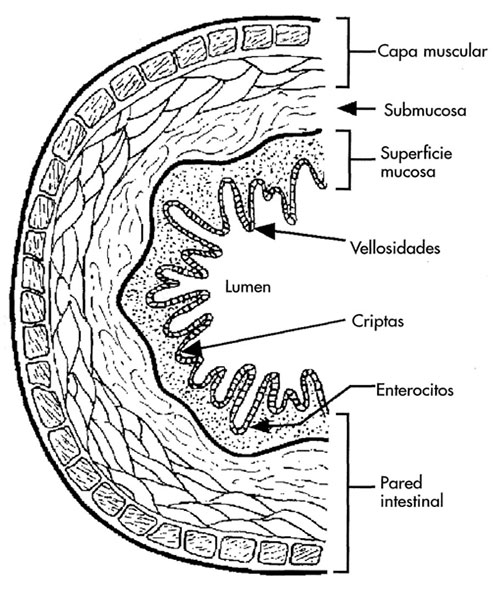El intestino tiene dos partes diferenciables: el intestino delgado y el grueso. La inflamación de la primera es llamada enteritis (aunque a veces enteritis puede significar inflamación de ambas partes) y colitis la última. La enteritis es muy común y causada por infecciones específicas por virus, bacterias y parásitos. El intestino delgado en la sección transversal contiene millones de proyecciones semejantes a dedos llamadas vellosidades.