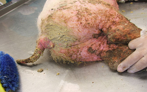Lesiones costrosas dispuestas en diversas áreas de la superficie de la piel que le infieren un aspecto repulsivo, destacándose especialmente en el rostro y pabellones auriculares. Material fecal semi-pastoso color grisáceo.