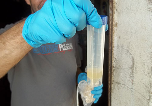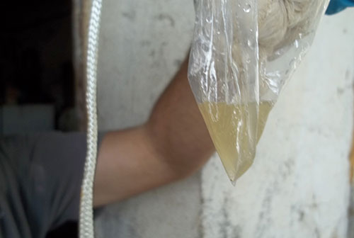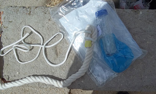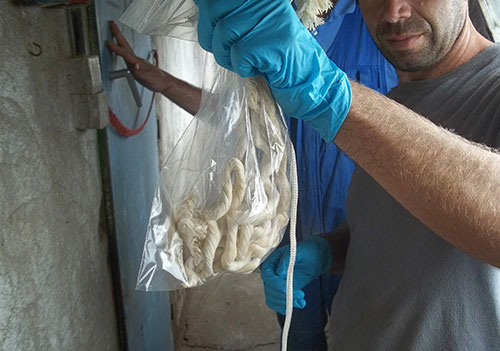 El Kit se compone de unos guantes de nitrilo que deben de utilizarse únicamente para una muestra, luego desecharlos. Una bolsa de plástico amplia donde se mete la cuerda y poderla retorcer dentro del envase y pasar el líquido, previo corte con una tijera, a un frasco estéril de una capacidad de 20 a 25 ml con fondo cónico y tapón enroscable, éste es el que se enviará por correo urgente al laboratorio en una caja de porexpan y con placas de frío lo antes posible. Cada kit lleva un folleto con la dirección del laboratorio y espacio para escribir en él todo tipo de datos, edad de los animales, vacunaciones, pruebas a realizar, etc.