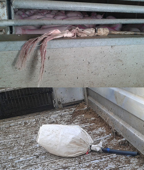 Cada grupo de cerdos tiene una forma de actuar condicionada a como se les ha criado; muchos animales son movidos con bolsas de plástico en la que introducimos una tubería para dar volumen y sonido a nuestros movimientos; otras veces usamos planchas metálicas, otras carracas, etc; pero si para su alimentación en la granja se produjesen sonidos de bolsas de plástico al sacar su pienso los animales estarían condicionados a ese sonido y no sería adecuado para su manejo desde atrás ya que tendría un efecto llamada contrario al deseado por el que maneja los cerdos para realizar un carga en un camión o cambiarlos de zona en la nave.