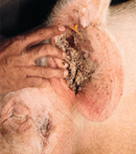 Todo esto es lo que lleva a la pérdida de crecimiento y empeoramiento del índice de conversión se calcula una media de un 8%. En el cebo es muy corriente observar como los cerdos mueven sus orejas enérgicamente de un lado a otro lo que llamamos “aleteo”, ya que el ácaro tiene predilección por la zona interna del pabellón auricular.