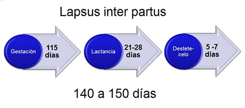 Si analizamos el lapsus inter partus (LIP) de una cerda, esta posee un largo de gestación de 114 días, una lactancia de 21 días y un periodo destete-celo de 5 días, la sumatoria de todo esto nos da un LIP de 140 días.