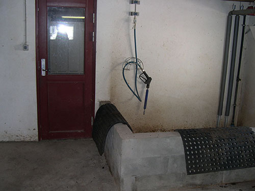 Los pediluvios internos para las botas en las granjas normalmente no se suelen poner quizás porque no se sabe la importancia de mantener una bioseguridad interna de la granja. Estos deben estar situados nada más salir de la zona de vestuarios con agua y desinfectante para las botas, así como antes de la entrada en cada una de las naves de la granja.