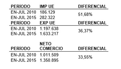 El primero de ellos es nuestro comercio con la UE, nuestro mercado de “exportación” tradicional y que ha sufrido un sustancioso incremento en los últimos 5 años, pasando de exportar 1.197 a 1.633 millones de euros a los países de nuestro entorno, con un incremento en el período de un 36,7%, aportando una balanza comercial positiva en este semestre de 1.350 millones de euros.