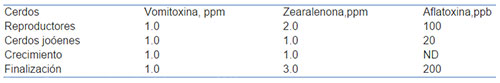 Tabla 2. Niveles máximos de micotoxinas recomendados en dietas de cerdos