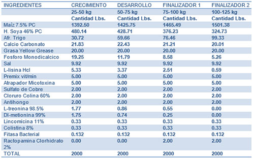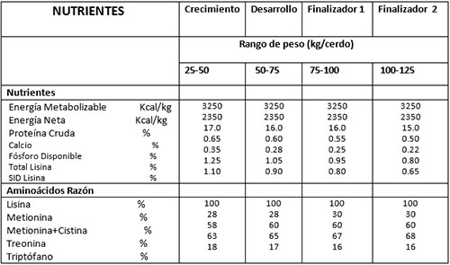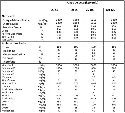Tabla 10. Especificaciones de alimentación para cerdos en crecimiento y finalización (castrados)