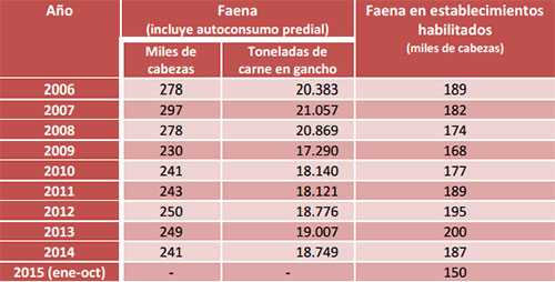 Estos datos indican una disminución de la faena para autoconsumo en relación a la faena habilitada. Según la información de INAC hay 17 establecimientos habilitados para la faena de carne porcina. En el año 2014 el 81% de la faena se concentró en dos empresas (Mirnabel S.A. y Ardistar S.A.). La actividad de faena de carne de cerdo se encuentra situada fundamentalmente al sur del país en los departamentos de Canelones, San José y Florida. Aproximadamente el 90% de la faena es de cerdos y cachorros y el restante 10% son lechones.