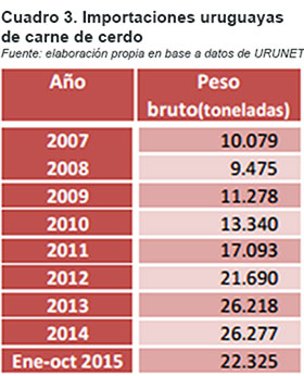 En Uruguay el consumo de carne de cerdo ha sido creciente en la última década y ha sido abastecido fundamentalmente por la importación, al tiempo que se registra un retroceso en la producción nacional debido a la alta competitividad del producto importado. El volumen de carne de cerdo importada por Uruguay creció de forma importante en el período 2007-2015.