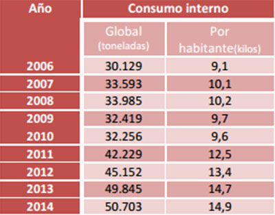 El consumo de carne de cerdo en el mercado interno ha crecido considerablemente en los últimos años (Cuadro 4). El consumo por habitante creció un 54% entre 2009 y 2014.Según datos de INAC el consumo de carnes por habitante en Uruguay en el año 2014 fue de 98,6 kilos, de los cuales 15 kilos correspondieron a carne de cerdo, es decir, que la carne porcina representa aproximadamente un 15% del consumo total de carnes.
