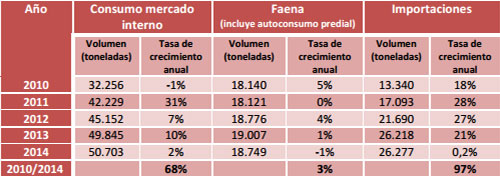 En el período considerado se verifica un aumento en las importaciones de carne de cerdo y subproductos, una caída de la producción local de carne porcina y un aumento del consumo interno del producto; esto implica que el crecimiento del consumo interno fue abasteci do por el crecimiento en las importaciones. Como se observa en el siguiente cuadro, actualmente un 64% de la carne de cerdo que se consume en el mercado interno procede del exterior – este porcentaje en 2006 era 35%.