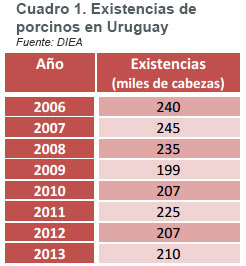 En base a los datos publicados en el Anuario Estadístico Agropecuario de DIEA para el año 2014, las existencias de suinos han disminuido en los últimos años. Durante los años 2006 a 2008 el promedio de las existencias de cerdos era de 240 mil cabezas. En el año 2009 se verificó una disminución de 15% respecto al año previo y el nivel de existencias se ha mantenido en un promedio de 210 mil cabezas en el período 2009-2013, con un pico en 2011 de 225 mil cabezas.