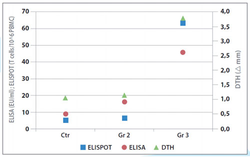 En este estudio demostramos el efecto de las diferentes formulaciones de las vacunas sobre la respuesta inmunitaria celular y los títulos de anticuerpos en suero de acuerdo con los resultados obtenidos en la prueba de hipersensibilidad retardada (DTH), el análisis ELISPOT (IFNγ) y el análisis ELISA (anticuerpos frente a Mh).