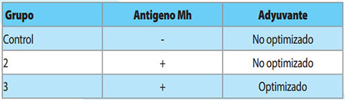 Se vacunaron tres grupos de 10 lechones cada uno, seronegativos a Mh, mediante una única inyección a las tres semanas de vida (D21) con las formulaciones que se muestran en la tabla 1. El contenido antigénico de la vacuna del grupo 2 y del grupo 3 fue el mismo, mientras que el adyuvante utilizado incluyó una cantidad variable de lipopolisacáridos no tóxicos de la cepa J5 de E. coli en una emulsión de aceite en agua. El contenido oleoso de las formulaciones también fue diferente.