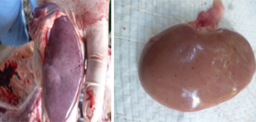 - Esplenomegalia (bazo color rojo azulado), en algunos casos con infartos marginales