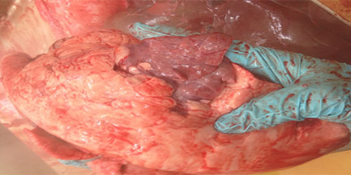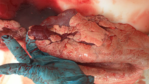 Los hallazgos en necropsia realizada a cerdos con edades de 17 y 18 semanas de vida fueron tos persistente productiva, con dificultad respiratoria, pérdida de condición corporal y severa disnea respiratoria.