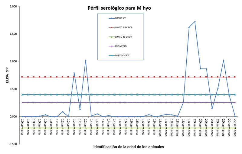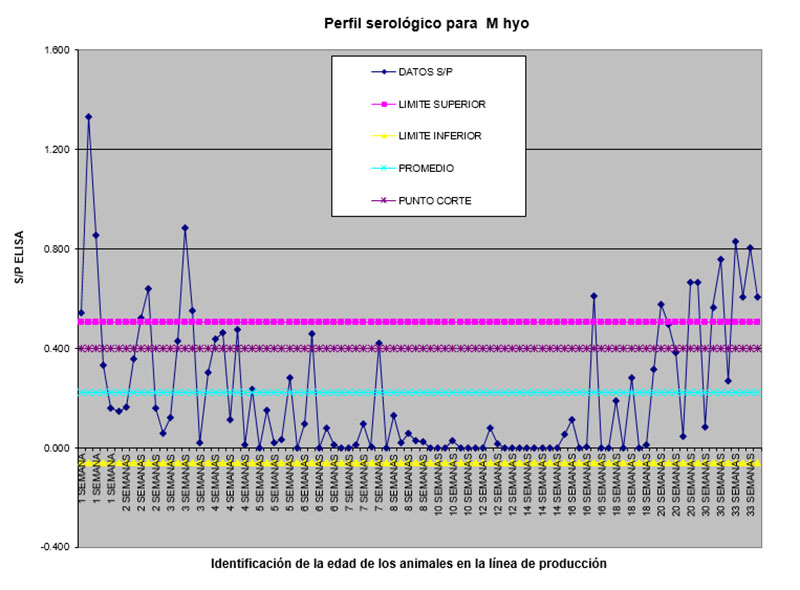 Desde la 6ª semana hasta la 16a semana de edad se observa una disminución de los niveles de anticuerpos, lo cual indica que no hay circulación del virus (baja exposición de Mycoplasma hyopneumoniae). A partir de las 16 semanas de edad se observa un desafío de campo e incremento de los anticuerpos o circulación del virus, lo que indica que la infección se inicia alrededor de la 2ª a 3ª semana antes de la seroconversión, o sea, alrededor de las 12 a 14 semanas de edad.