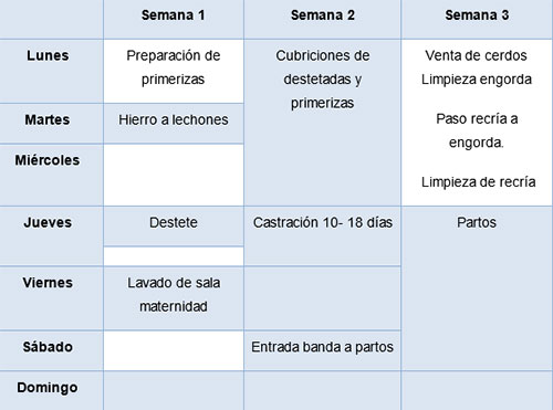 - Los trabajadores de las diferentes áreas pueden ayudarse entre ellos al no coincidir temporalmente su trabajo, pues en la primera semana se desteta, en la segunda se realizan las cubriciones y el tercera semana se atienden los partos, y así sucesivamente.