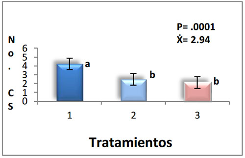 Existieron diferencias (P=0.0001) en el número de CS entre los tratamientos. La concentración de CS en el T1 fue de 4.23, vs Sulfato y Oxido respectivamente (2.49 y 2.11 CS) (Grafica 1).