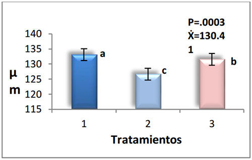 El diámetro (µm) de los túbulos seminíferos mostró ser diferente (P=0.0003) entre los tratamientos, ya que el tratamiento que contenía sulfato como fuente de Zn, presentó un diámetro tubular menor (126.60 µm) al del testigo y al que tenía óxido de Zn.f