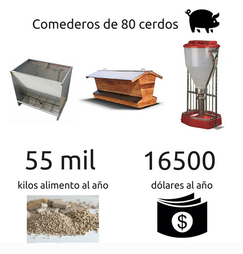 Si la granja produce 500 cerdos semanales, esta posee en su inventario un total de 11.000 cerdos aproximadamente, por lo que la cantidad de comederos necesarios para su alimentación es de 138 unidades. Si esta granja tuviese un 8% de pérdida de alimento, diariamente tendría pérdidas económicas de 374 dólares diarios (138 comederos por USD 2,71). Los valores anteriores se tomaron en base al ejemplo de comparación de las 2 granjas.