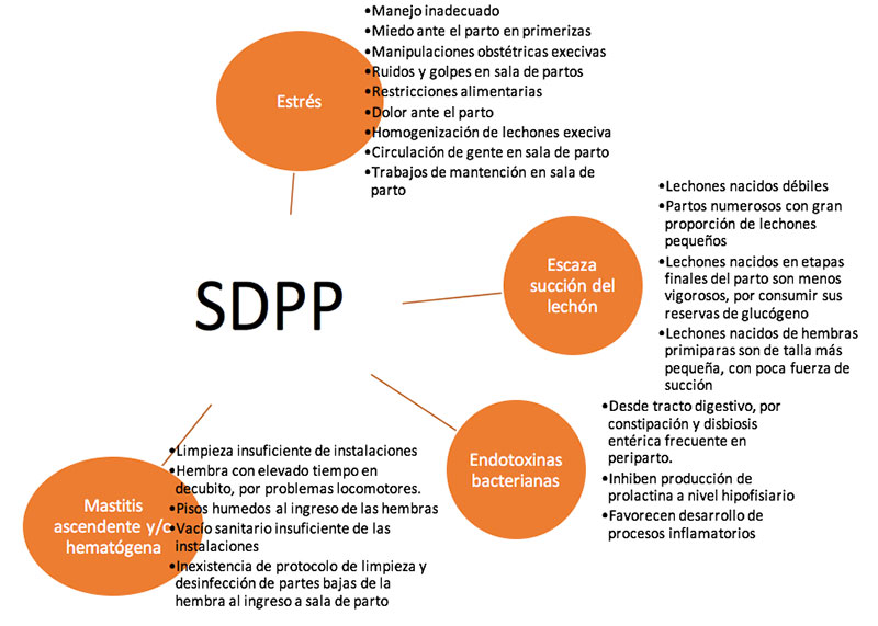 Finalmente, la misma infección de la glándula mamaria, la cual puede ser de origen galactogénica-ascendete o sistémica, es un importante elemento dentro del SDPP. Su etiología está principalmente ligada a normas de manejo dentro de la sala de parto, siendo la higiene y desinfección un factor fundamental.