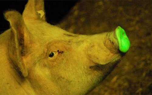 8. Soñar no es lo único que los cerdos tienen en común con los humanos - su composición genética también es muy parecida a la nuestra. Debido a esto, las células madre de cerdos están siendo utilizados por los científicos para investigar remedios para las enfermedades humanas. Para realizar el seguimiento de las células una vez que han sido inyectadas, genetistas chinos han cruzado un cerdo con una medusa, resultando en lechones cuyas lenguas y patas muestran una luz verde fluorescente bajo la luz ultravioleta.