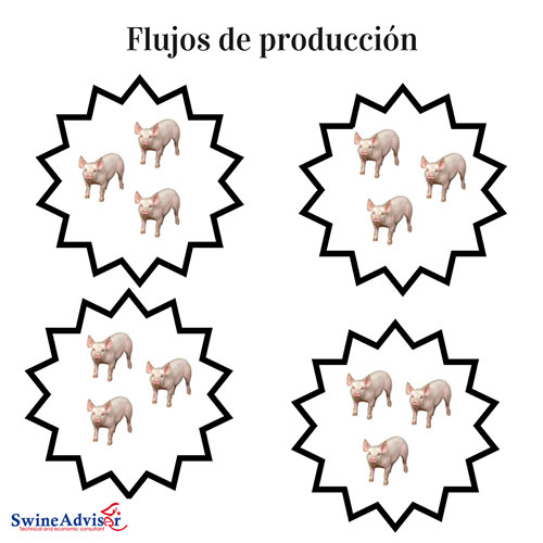 Para cualquier especialista en sanidad porcina, los flujos de producción son un punto critico para el control eficaz de las enfermedades. Pues el manejo sanitario es muy fácil evaluarlo cuando los animales son manejados por flujos, se toman muestras para esa semana, se realiza un vacunación, se determina la seroconversión, etc. Cuando no realizamos un manejo todo dentro-todo fuera, o sea, se mezclan diferentes edades de animales más de un flujo de producción, aparecen los problemas y los animales mayores traspasan los patógenos a los animales menores, estos últimos se enferman, aumentan la carga de patógenos y ocurre el quiebre inmunitario en toda la población.