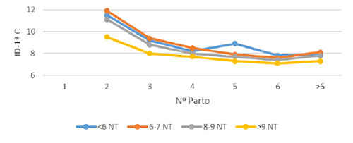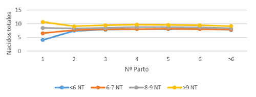 Gráfico 1. Evolución de los nacidos totales (NT) en la vida productiva en función de los NT en el primer parto