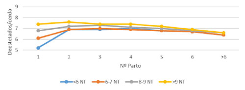 Gráfico 2. Evolución de los lechones destetados por parto (LDP) en la vida productiva en función de los NT en el primer parto