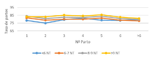 El siguiente parámetro analizado fue la tasa de partos (TP) por parto. El gráfico 3 muestra dicha distribución, siendo respectivamente 78.5, 79.8, 81.9 y 83.4 % como media de su vida reproductiva, pero mostrando también una evolución consistente a lo largo del tiempo.