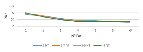 Analizamos por último los días no productivos (DNP) por ciclo, que también disminuyen en función de los NT en el primer parto, resultando en las medias 50.2, 46.6, 44.1 y 42.7 respectivamente. Los resultados se muestran en el gráfico 5.