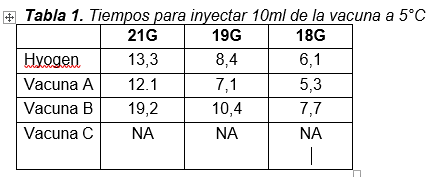 A una temperatura de 5°C, la Vacuna C fue bloqueada en las agujas (no fue inyectable), sin importar el diámetro. Hyogen® y la vacuna A tuvieron una media para el tiempo de acumulación menor que la Vacuna B o la Vacuna C (p<0.05).