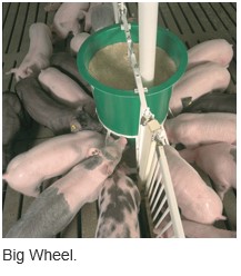 A diferencia de los comederos con flujo de gravedad, los comederos Big Wheel no dependen de la gravedad para entregar alimento. Al contrario, mientras comen los cerdos giran una rueda con varias puntas en el fondo del plato. Un barredor de alimento, ubicado al interior de la tolva y unido a la rueda, literalmente “barre” el alimento bajo el cono y hacia fuera de la tolva. Al mover la rueda para un lado y otro el alimento sale para los cerdos.