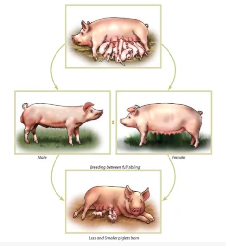 En la cría provoca disminución del tamaño de la camada y aumenta la mortalidad. Las cerdas endogámicas tienen una inferior capacidad de producir leche y maternidad. Retrasa la madurez sexual en primerizas y verracos. Los verracos consanguíneos tienen menos libido sexual. Las primerizas consanguíneas tienen menos huevos durante el celo y dan a luz camadas más pequeñas que las que no son consanguíneas con el macho.