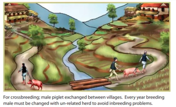 Para hacer el cruce de razas se cambia un lechón macho entre los poblados. Cada año el macho para reproducción debe cambiarse con un macho que no tenga relación con el hato para evitar problemas de consaguinidad.