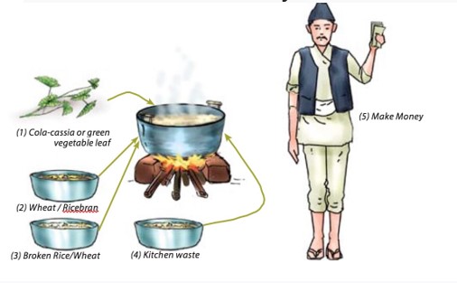 Los piensos para cerdos también se pueden preparar con productos forestales (hortalizas silvestres, plátanos silvestres, cola – casia silvestre, etc.) Al mismo tiempo, también se pueden utilizar los residuos de alimentos. Actualmente, el cultivo de legumbres como alimento para la producción de cerdos en las aldeas está teniendo un gran impacto en los medios de vida de las familias rurales de Nepal.