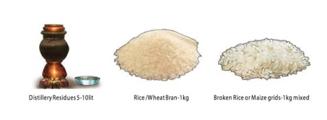 La siguiente proporción de mezcla se usa comúnmente en combinación con desechos de destilería: salvado de arroz / salvado de trigo (2 kg), arroz partido (1 kg) y residuos de destilería (5-10 kg) y otros subproductos agrícolas disponibles localmente.