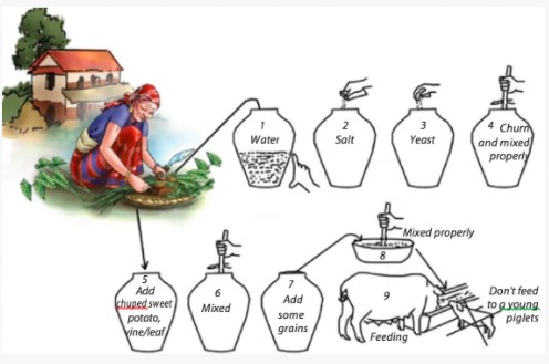 El alcohol local se puede hacer con mijo, arroz, maíz, batata, ñame (Phul Tarul), plátano, etc. Los más populares para la alimentación de cerdos son los desechos de destilería de mijo y arroz, el contenido de proteínas varía de 17 a 33% (media de 23%) en base a materia seca. Debe mezclarse con otros alimentos como salvado de arroz, salvado de trigo, harina de maíz / mijo y arroz partido, etc.